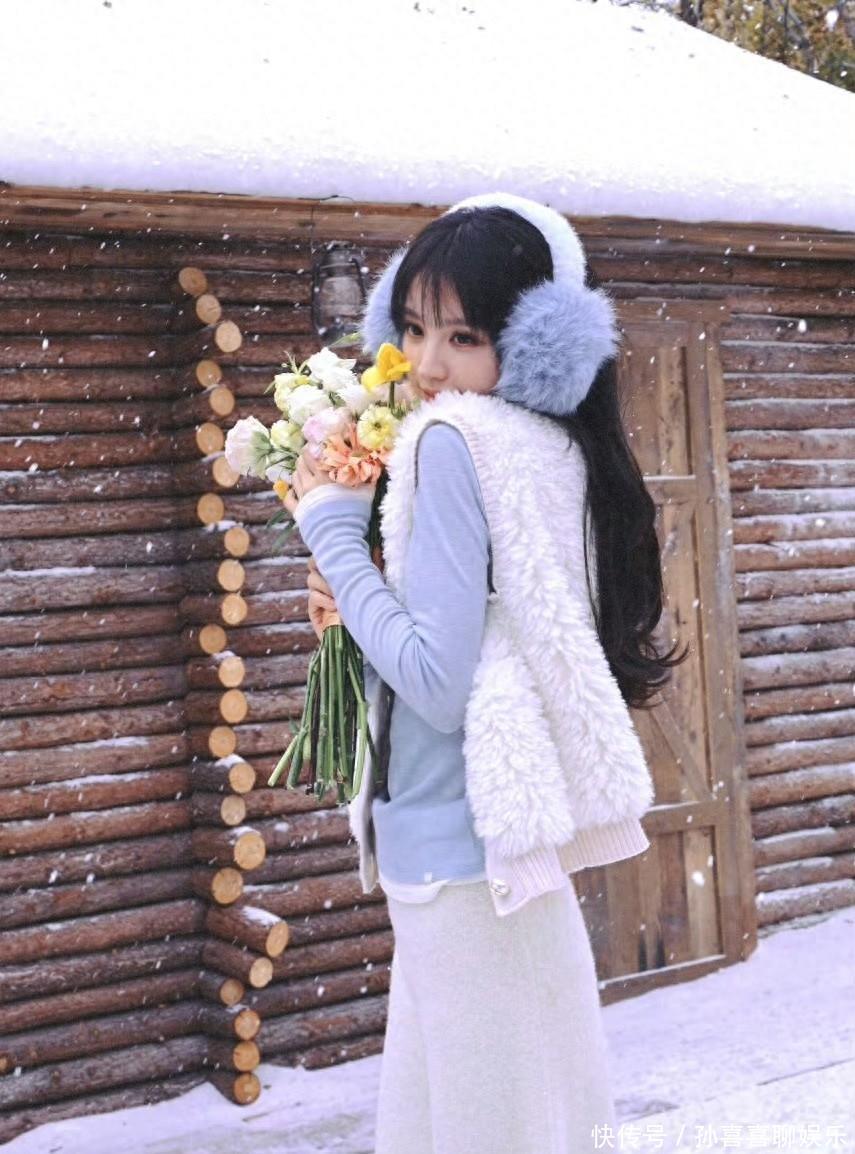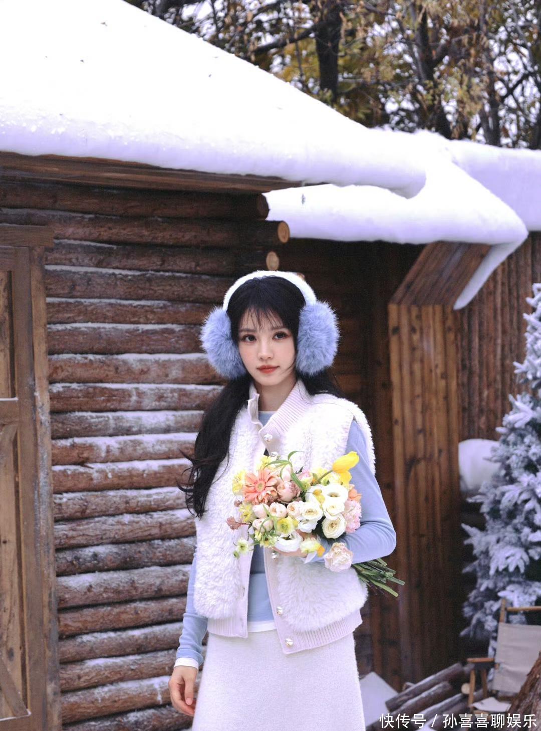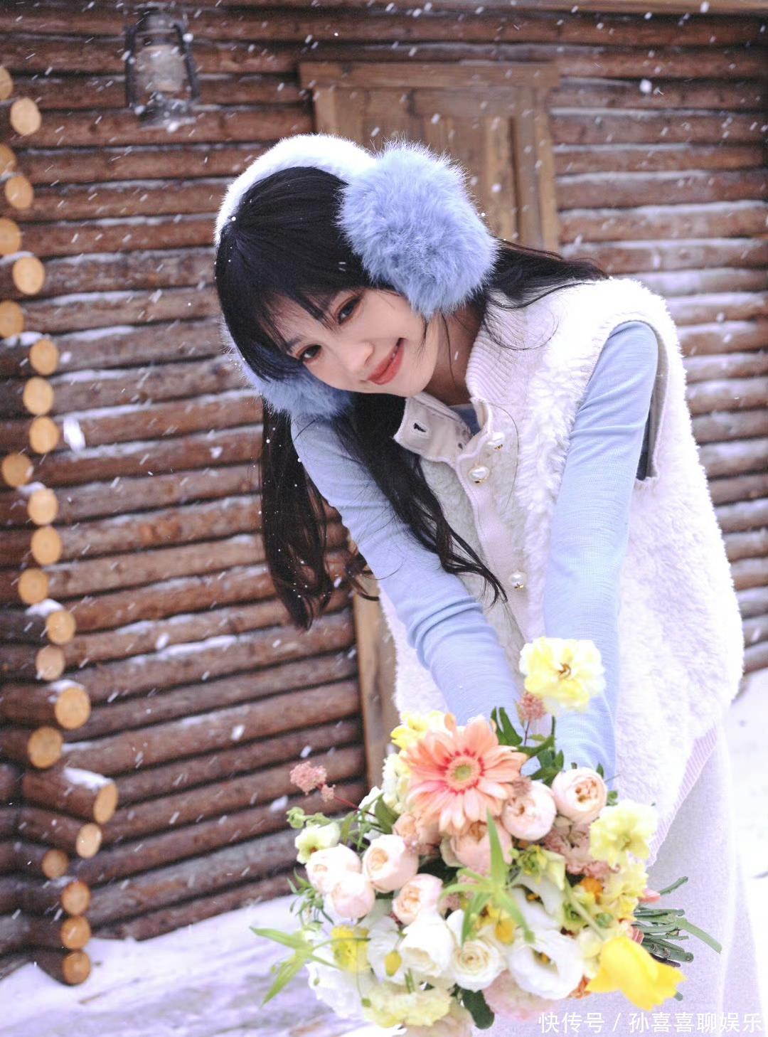 手捧花束站在白雪里,淡色彩与雪景相融,青娥感扑面而来,像冬日里裹着糖霜的棉花糖,软糯又透着鲜嫩劲儿。