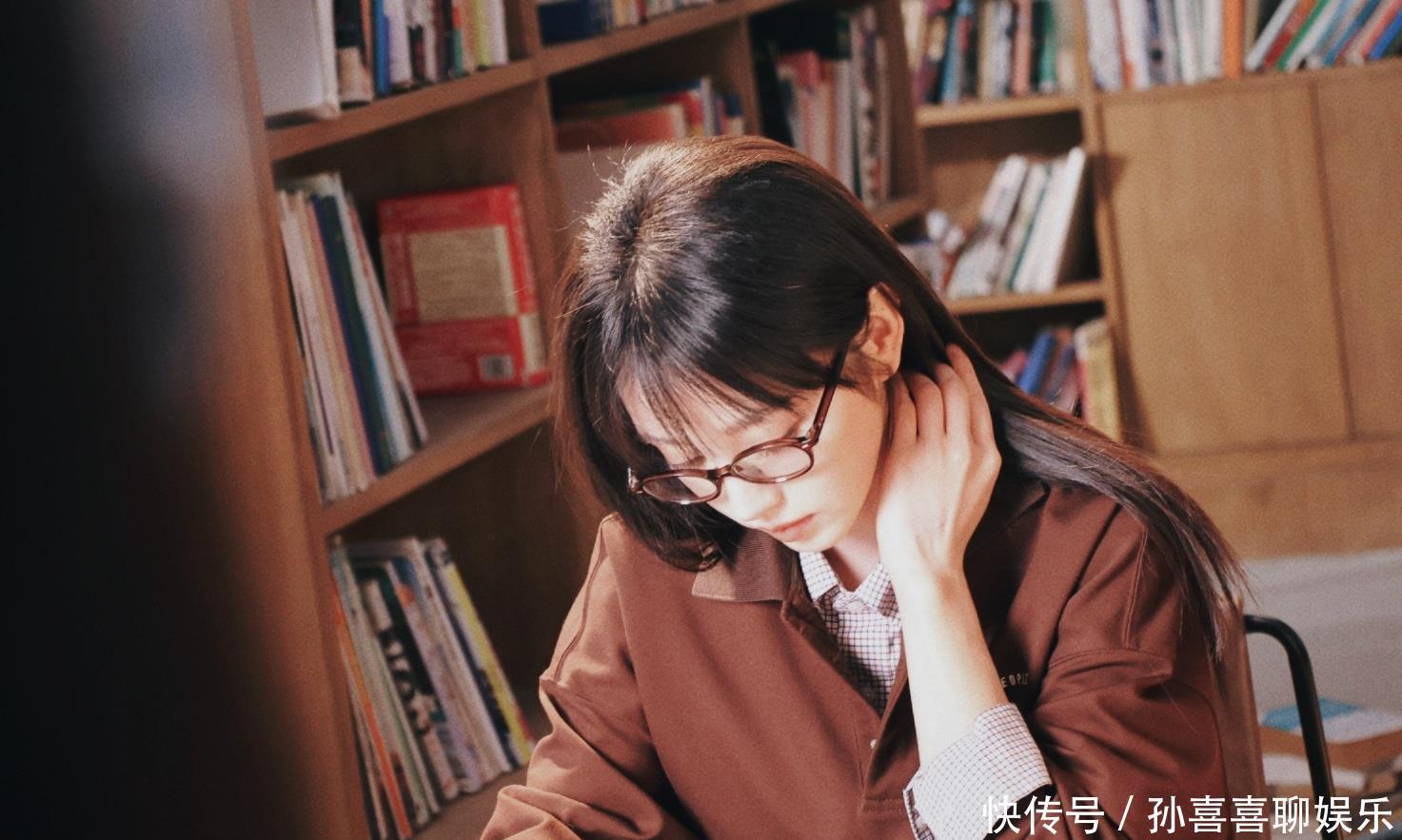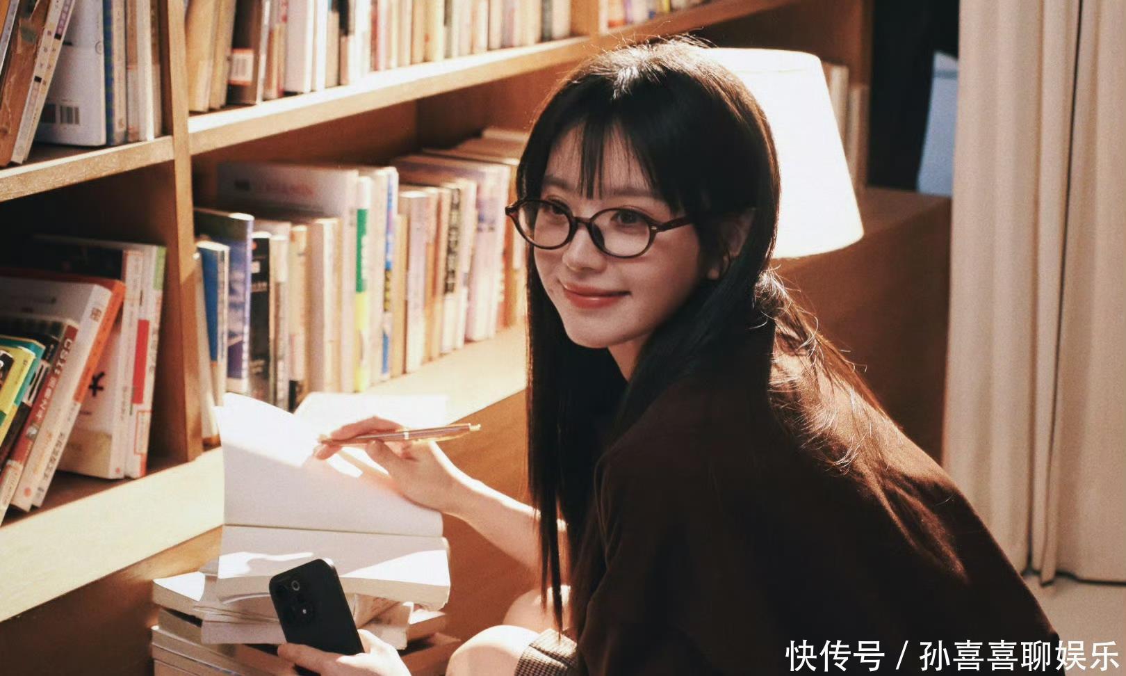 蹲在书架边,身着深棕真挚外衣,鼻梁上架着一副黑框眼镜,一手抓笔、一手攥入部下手机,回眸看向镜头的顷刻间,唇边漾开淡淡的笑。