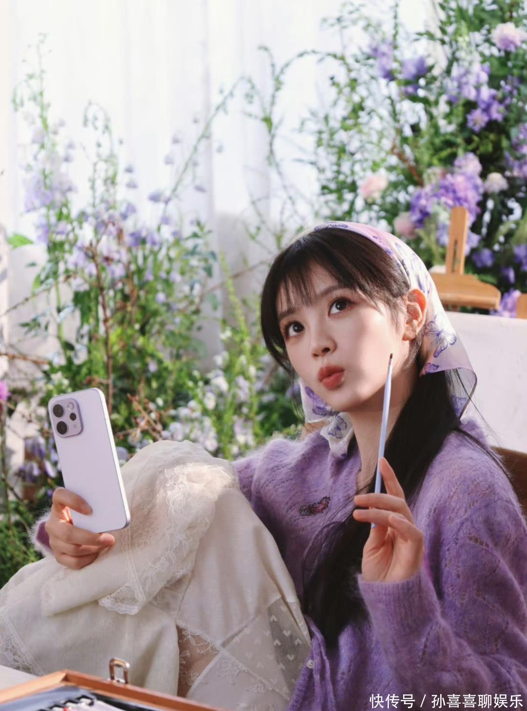 淡紫色马海毛开衫极新清雅,印花丝巾系在发间添了几分圭表狂妄,一手举入部下手机、一手抓着画笔的当作俏丽可人。