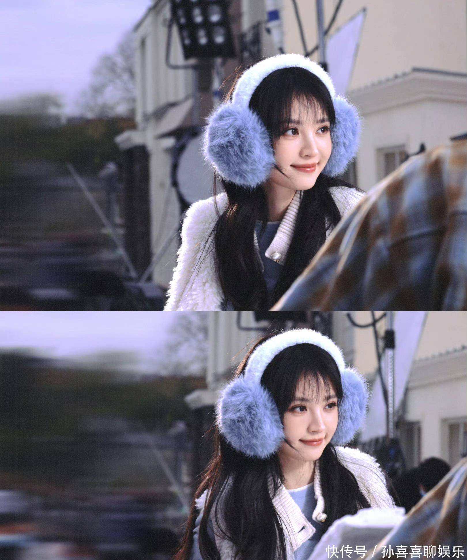 浅蓝打底叠穿白色毛绒马甲,下配同色系真挚半裙,再戴上蓬松的蓝色毛绒耳罩,面颊被衬得愈发娇俏。