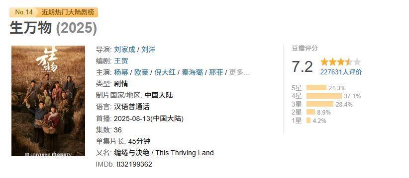 而且有他在,这部剧的收视得益亦然十分顶,是以尽管豆瓣评分略逊于《生万物》,但排在前一位显着不是莫得原因的,二刷依旧耐看。