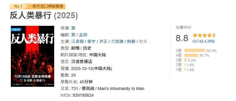 好的历史剧除了要规复真相,也要具备教师意旨,而这部《反东说念主类暴行》看完后大致让东说念主紧记历史羞辱,内心久久不成安心,显着是许多国剧都够不上的高度。