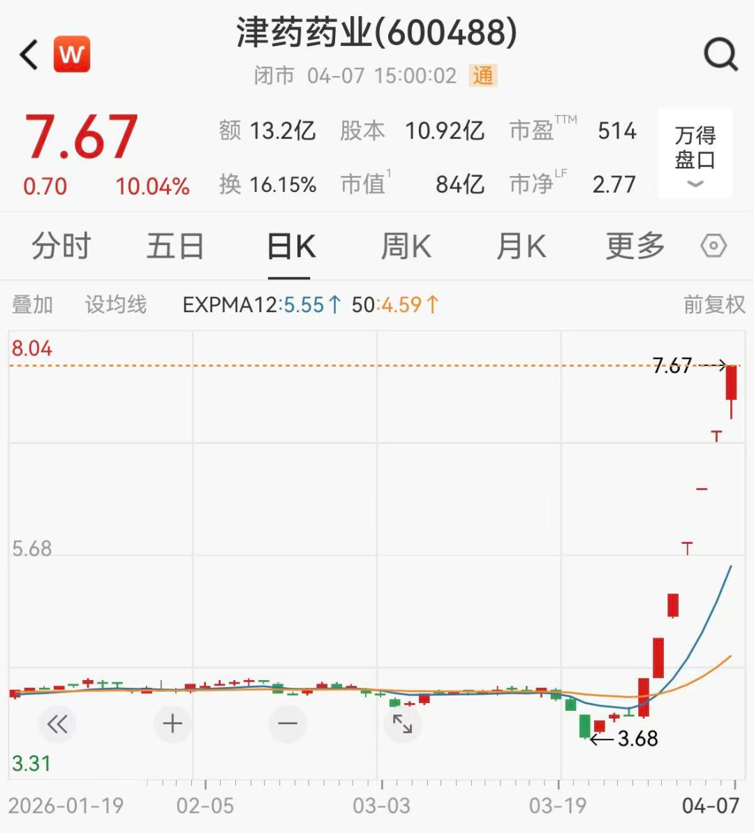 其中津药药业的股价异动尤为激勉商场热心。该股衔尾10个来回日内(3月24日至4月7日)日收盘价钱涨幅偏离值累计达到100%,3月26日至4月7日历间,公司股票衔尾七个来回日涨停,期间股票价钱累计涨幅93.69%。箝制4月7日收盘,每股报价7.67元,市值约84亿元。