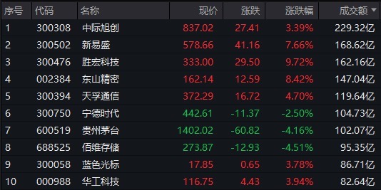 个股方面,中际旭创半日成交额超229亿元居首,新易盛、胜宏科技、东山精密成交额靠前。