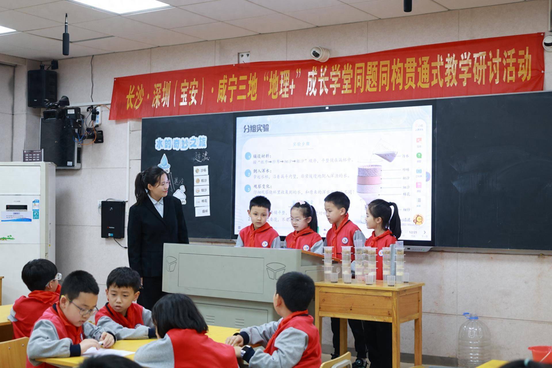 长沙市长塘里小学朱硕憨厚执教科学示范课《水的奇妙之旅》,依托AI援助教训,聚焦学生问题感知与科学抒发能力培养。课堂以“水的奇妙之旅”情境导入,次第探究水的样子变化、三态诊治要求,组织学生开展援助小水点过滤实验,并联接生涯实质渗入水资源保护培植,教训体式连结当然,逻辑层层递进。教训中,西宾善用启发式发问,兴趣倾听学生着实主义,实时捕捉“小伙伴去哪了?”“水为什么变少了?”等课堂生成性问题,充分突显学生主体地位。